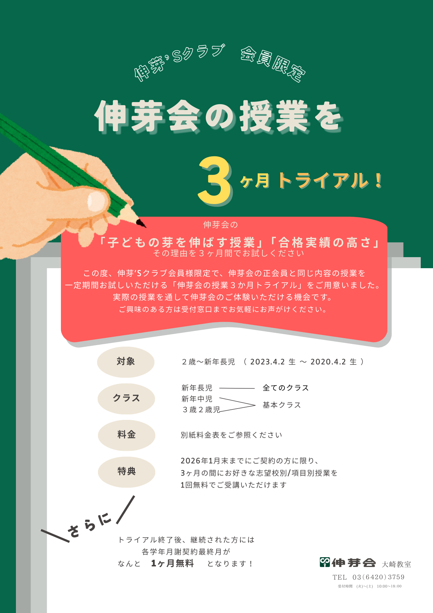 一定期間お試しいただける「伸芽会の授業3カ月トライアル」をご用意いたしました。